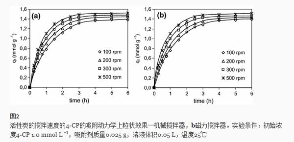 可以看出,吸附速率受攪拌速度的影響很大 - 吸附速率隨攪拌速度顯著增加。隨著攪拌速率從100rpm增加到500rpm,k 2值分別從0.577增加到1.264g mmol -1 h -1(機(jī)械攪拌器)和0.560-1.231g mmol -1 h -1(磁力攪拌器)。在相同的攪拌速度下,機(jī)械攪拌器和磁力攪拌器之間的差異沒有統(tǒng)計(jì)學(xué)意義(p > 0.05)。隨著攪拌速度的提高,4-CP分子從大塊液體向活性炭顆粒周圍的液體邊界層擴(kuò)散的速率變得更高,這是因?yàn)槲闪鞯脑鰪?qiáng)和液體厚度的減小邊界層。隨著攪拌速度的增加,吸附劑顆粒破碎的程度增加,這種效果可能會進(jìn)一步增強(qiáng)。在這些研究中,試驗(yàn)前和試驗(yàn)后的吸附劑的顆粒大小沒有測定,但在4-CP的吸附動力學(xué)的活性炭的粒子大小的影響是有據(jù)可查的。還描述了攪拌速度吸附率的增加為堿性染料的吸附上活性白土[ 6 ]以及乙酸,吡蟲啉和4-氯苯酚在活性炭上。