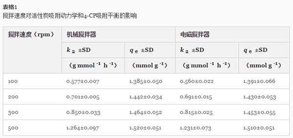 表1中的數(shù)據(jù) 也表明,攪拌速率不僅影響吸附動力學(xué),而且影響4-CP從水中的去除效率。吸附容量從1.385增加到1.520 mmol·g -1(機(jī)械攪拌器)和從1.391增加到1.510 mmol·g -1(磁力攪拌器),攪拌速度從100增加到500rpm。觀察到從20.06 4-CP的吸附容量的增加至23.04毫克克-1攪拌速度從300到600轉(zhuǎn)。然而,一些作者已報(bào)道,用增加攪拌速度只能達(dá)到一定的限度,超過此有在吸附容量無顯著增加吸附增加。在一些情況下,觀察到在更高的攪拌速率在吸附容量的降低。正如作者所提出的,這是由于這樣一個(gè)事實(shí),即在非常高的攪拌速度下,吸附分子和吸附劑顆粒的動能增加到足以使它們相互碰撞而導(dǎo)致分離松散結(jié)合的吸附分子。