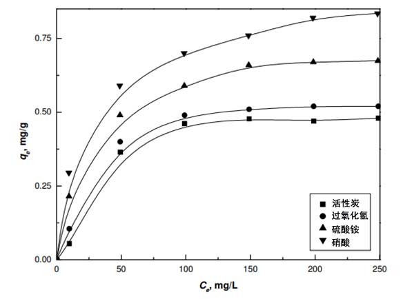 用活性炭和改性活性炭進(jìn)行平衡吸附實(shí)驗(yàn),以評(píng)估它們使用合成的鎳廢水從水性介質(zhì)中除去二價(jià)鎳的能力。通過用0.1g活性炭與50mL濃度范圍為10mg/L至250mg/L的Ni(II)溶液平衡進(jìn)行實(shí)驗(yàn),結(jié)果顯示在圖2中;钚蕴康拿靠宋饺萘恐蛋匆韵马樞蛟黾樱夯钚蕴>過氧化氫>硫酸銨>濃硝酸。氧化活性炭的容量增加是由于存在大量酸性基團(tuán),其可以與水溶液中存在的陽(yáng)離子鎳交換它們的質(zhì)子。