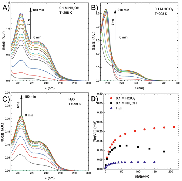 對于解吸研究,在25℃吸附后,200cm3溶液使用1g活性炭。Re(VII)離子的初始濃度為0.5mM。吸附后,將樣品分成三部分。然后在三種環(huán)境中進(jìn)行解吸,即0.1M/HClO4、0.1M/NH4OH和H2O。在所有情況下,每50cm3液體使用0.3g活性炭。UV-Vis光譜和動(dòng)力學(xué)曲線如圖4。