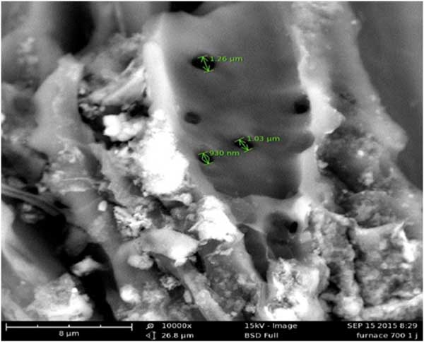 由于上述陶瓷膜去除污染物的多重優(yōu)勢(shì)和有前途的特性,分析陶瓷膜中不同活性炭和氧化鐵粉末含量的影響。使用掃描電子顯微鏡研究活性炭材料的微觀結(jié)構(gòu)。圖1描繪了使用ZnCl2/50vol%在10,000倍放大倍數(shù)下活化后的活性炭的孔隙。發(fā)現(xiàn)活性炭的孔徑顯示尺寸范圍在0.93μm–1.26μm之間。