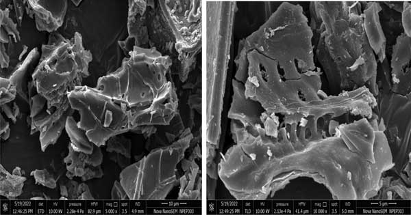 使用掃描電子顯微鏡分析獲得的活性炭的孔結構。SEM設備具有超高分辨率低電壓成像和獨特的低真空能力。SEM圖像是在15kV時以1nm、1kV時1.4nm、3kV時1.8nm和30Pa的不同分辨率拍攝的。觀察活性炭的表面物理形態(tài)是通過使用SEM完成的技術。圖3顯示活性炭的SEM圖像。這表明活性炭的外表面具有均勻開放的大孔。此外,活性炭的表面是高度多孔的,其特點是不均勻。同樣清楚的是,活性炭在其外表面具有微孔和空腔,暗區(qū)位于該處。經受碳化后,活性炭由于ZnCl2的蒸發(fā)而產生空隙(稱為氣孔)?梢詫⑦@些孔視為通向微孔網絡的通道。