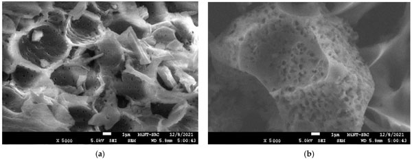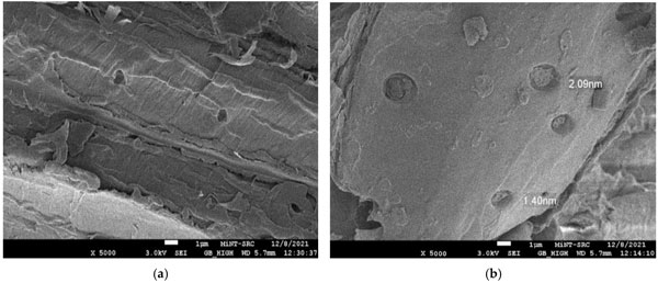 使用FESEM分析觀察了活性炭產(chǎn)品的浸漬和碳化溫度影響的形態(tài)變化。圖1a、b描繪了木質(zhì)素在被激活之前的表面形態(tài)。它顯示出厚而平坦的圖案,中間有小裂縫。這歸因于大量的木質(zhì)素,一種酚類聚合物,賦予植物結(jié)構(gòu)強(qiáng)度,使其具有堅(jiān)硬粗糙的木材狀結(jié)構(gòu)。在圖1b中,發(fā)現(xiàn)前體具有壓實(shí)的表面,上面有淺而堵塞的孔隙圖案。這可能是由于烘箱干燥過程中預(yù)處理和加熱過程的反應(yīng)。從圖1a、b,由于無孔表面的存在,表面清楚地顯示為不令人滿意的吸附材料。