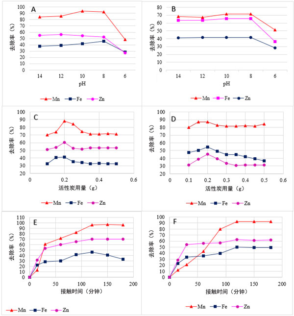 在分批吸附研究中,pH值是一個(gè)重要因素,它會(huì)通過改變所用吸附劑的表面電荷分布來影響吸附過程。在6和14的范圍內(nèi)觀察到木材加工廢水中重金屬(Mn、Fe和Zn)的pH相關(guān)影響。圖3A、B清楚地表明,當(dāng)纖維板加工廢水中的Mn、Fe和Zn分別使用pH8時(shí),兩種活性炭均獲得最佳結(jié)果。