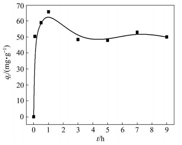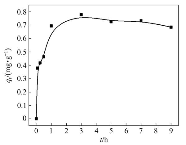 用100mL硫代硫酸銅溶液進行銅吸附動力學試驗,初始銅濃度為3g/L。硫代硫酸鹽與銅的摩爾比為8:1。除另有說明外,0.5g活性炭用于吸附試驗。圖2顯示了Cu(S2O3)23−在活性炭上的吸附動力學;钚蕴繉︺~的吸附容量在前1h急劇增加,隨后略有下降并趨于穩(wěn)定。