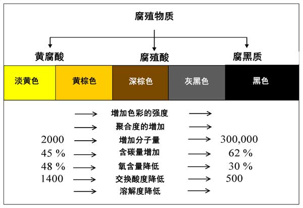腐殖質的性質與其成分有非常密切的聯(lián)系,其成分受到腐殖化過程的影響,與分子(分子量)和顆粒的大小、分散程度(真溶液或膠體溶液)、極性(由這些決定)由骨架的性質(芳香族;脂肪族)決定,主要是官能團的類型、數量和解離能力。腐殖質成分的功能在于其在水中的溶解度(黃腐酸的溶解度比腐植酸高,因此天然水中平均含有87%的黃腐酸)、聚集能力、解離能力(主要是羧基)官能團)和相關的電荷比(粒子的zeta電位)。腐殖質的一些特性也受到水的成分及其pH值的影響。圖1顯示了腐殖質的基本特性。